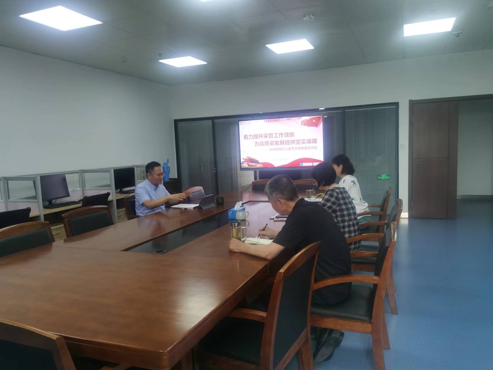 随后大家就“着力提升采管工作效能,为高质量发展提供坚实保障”开展讨论。黄贤东在发言中,首先谈了“走在前列的要求是什么”“我们的差距在哪里”“下一步怎么干”的思考和感悟。他认为,从“争当表率、争做示范、走在前列”到“在高质量发展上继续走在前列”,总书记对江苏现代化建设的定位一以贯之、要求与时俱进,既是党的核心对江苏作为改革发展前沿的厚爱和重托,更体现了大国领袖对中国式现代化建设的高瞻远瞩、深谋远虑。他强调,我们要牢记习近平总书记对江苏的深切期望和对学校“优化组合、转型化合”的殷殷嘱托,努力把“好地方”的好大学办好。他要求,采购管理党员、干部要准确把握采管职能定位,努力在廉洁高效、担当作为方面争当表率;在内部控制、风险管理方面争做示范;在践行以师生为中心发展思想,服务学校发展大局方面走在前列。
