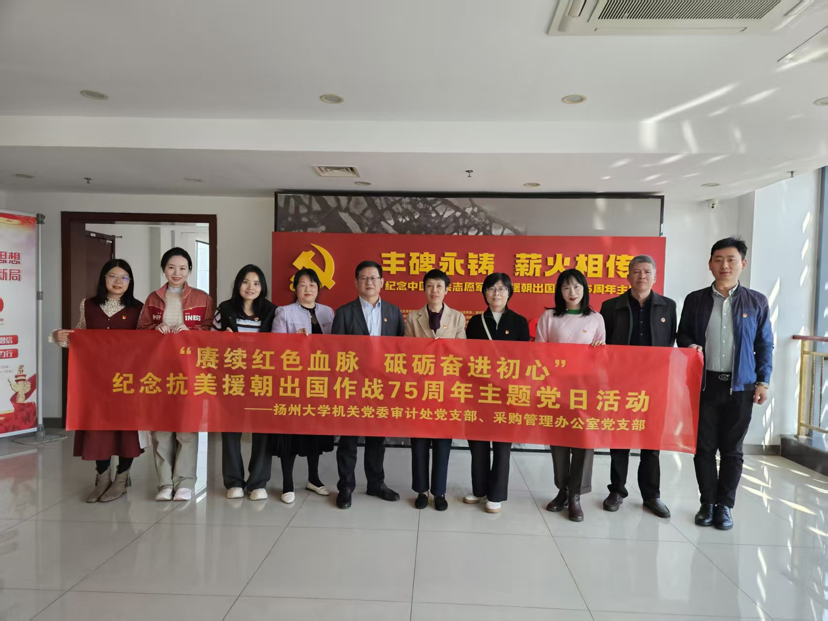 两支部全体党员步入扬州市档案馆“纪念中国人民志愿军抗美援朝出国作战75周年”主题展厅,参观展览。展览紧紧围绕弘扬爱国主义精神和革命乐观主义精神的主题,通过百余件历史照片、文献资料、珍贵实物全面回顾中国共产党领导抗美援朝战争的光辉历程和宝贵经验,展示了扬州籍中国人民志愿军的英雄事迹和革命精神。