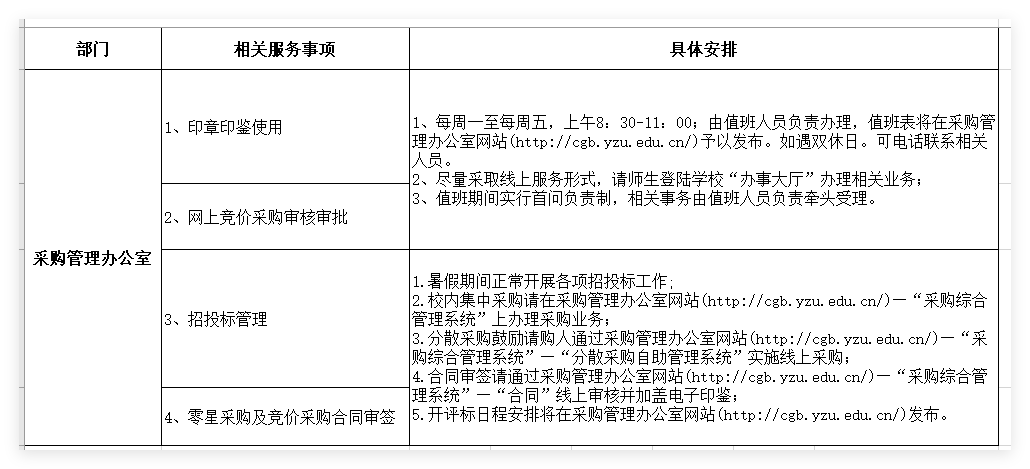 扬州大学2025年暑假期间集中服务师生事项安排一览表